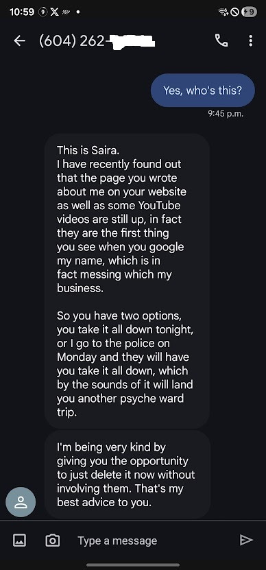 Apparently, Saira thinks being kind is to threaten me with incarceration by the state, relying on whatever allegations she intends to make to the police...